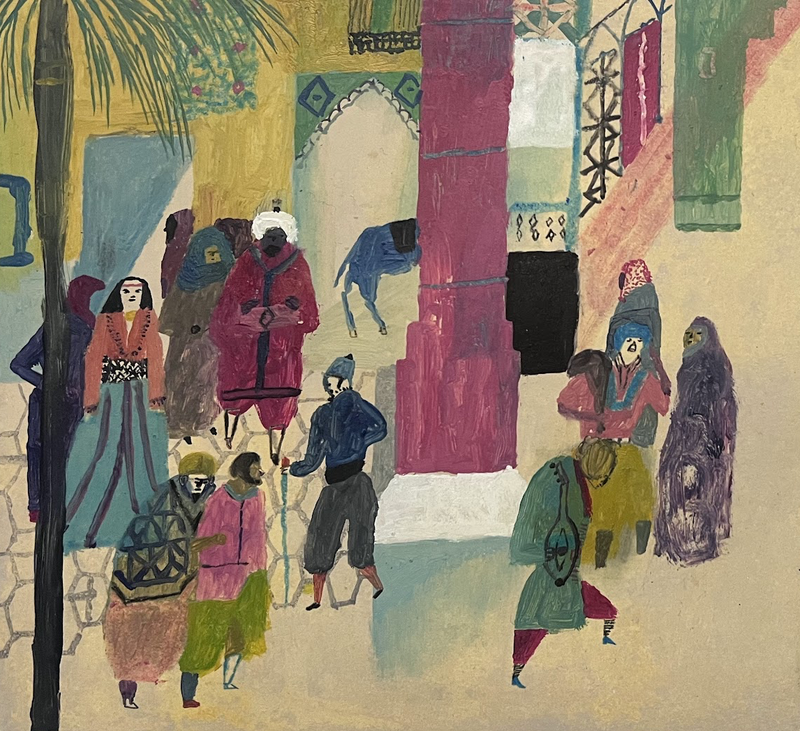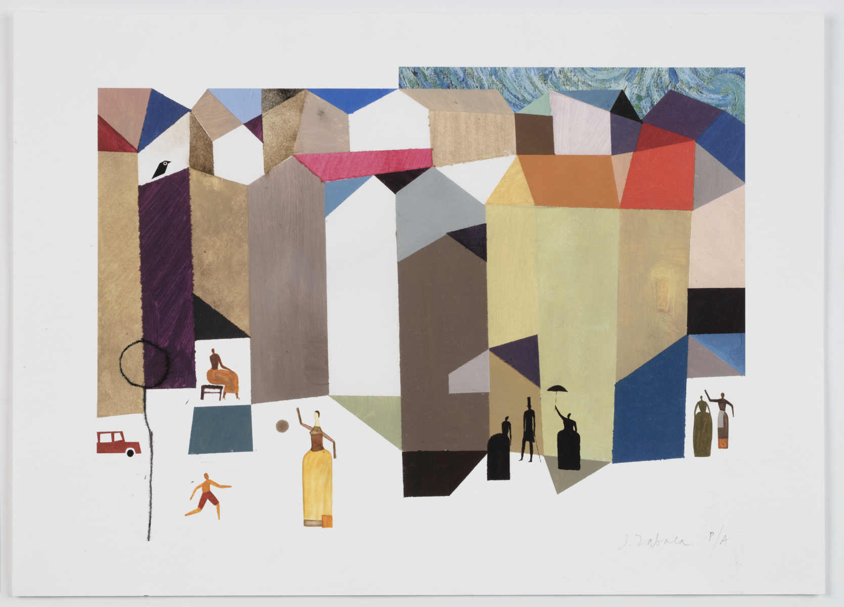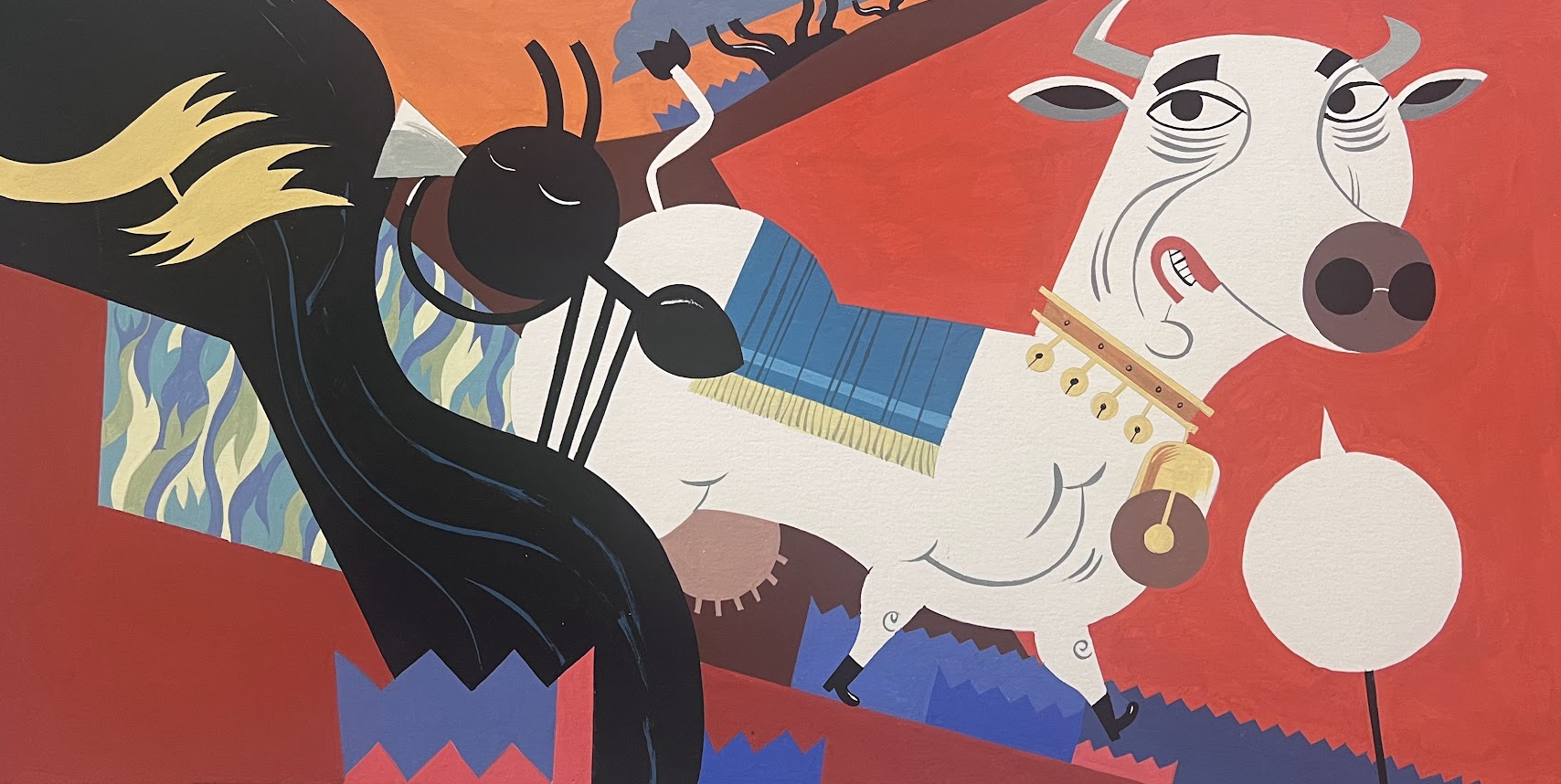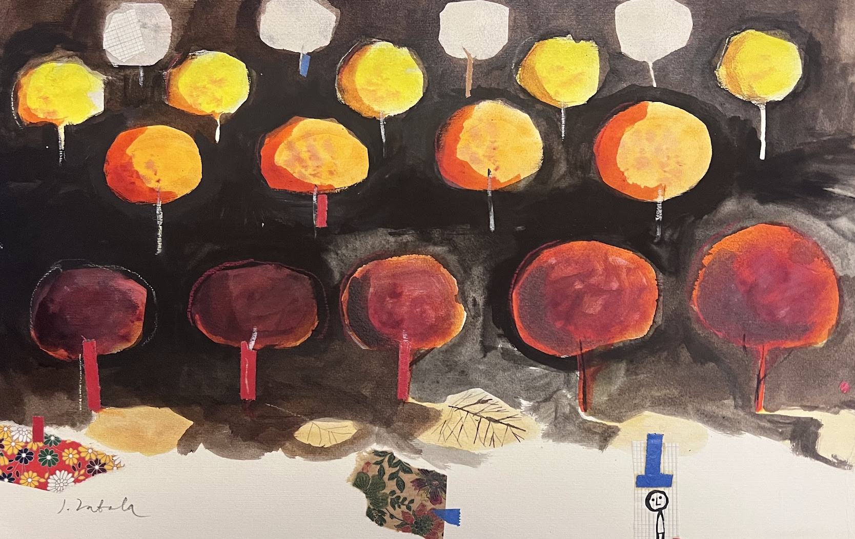 Santosův rukopis je rozpoznatelný na první pohled. Schematické, silně stylizované postavy, jasné barevné plochy a kompozice, která působí jednoduše – ale je přesná a promyšlená.